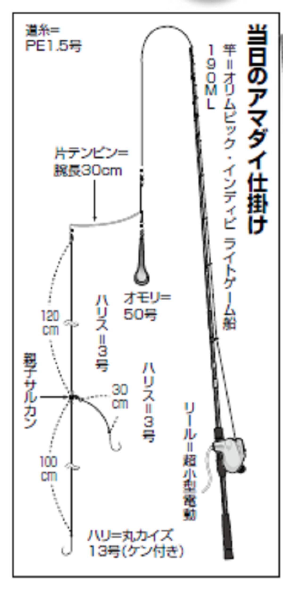 アマダイ仕掛 餌が刺しやすくオキアミの姿勢が良いケン付丸海津針を使用した仕掛けです。 枝ハリス部分の接続にはヨレに強い回転ビーズを使用。 チモト部分には魚にアピールし潮に馴染むクリスタルビーズを挿入した万全仕掛けです。 アマダイ仕掛 アマダイ天秤仕掛け 最初に紹介するのは胴付き仕掛け、または天秤仕掛けです。 2メートル前後のロッドと中型の両軸リールか、電動リールを付けていきます。 道糸はPEラインの5号前後、重りは60号前後で、ラインはフロロカーボン5号あたりを使うと良いているアマダイ釣りが関東で最も盛ん なエリアが相模湾だ。今回はアマダイ 釣りの名手、田渕雅生さんがダイワの 最強タックルに加え、新しく発売された アマダイ仕掛けを持って、激戦区相模 湾に釣行した模様をお届けしよう。